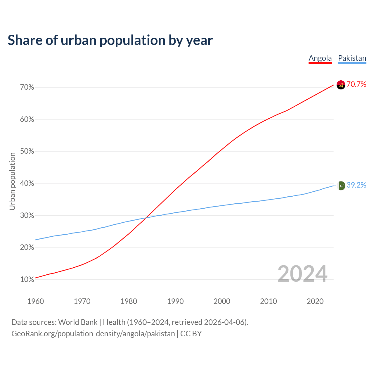 From 2004 to 2024, the share of urban population changed from 55% to 70.7% in Angola and from 33.7% to 39.2% in Pakistan.