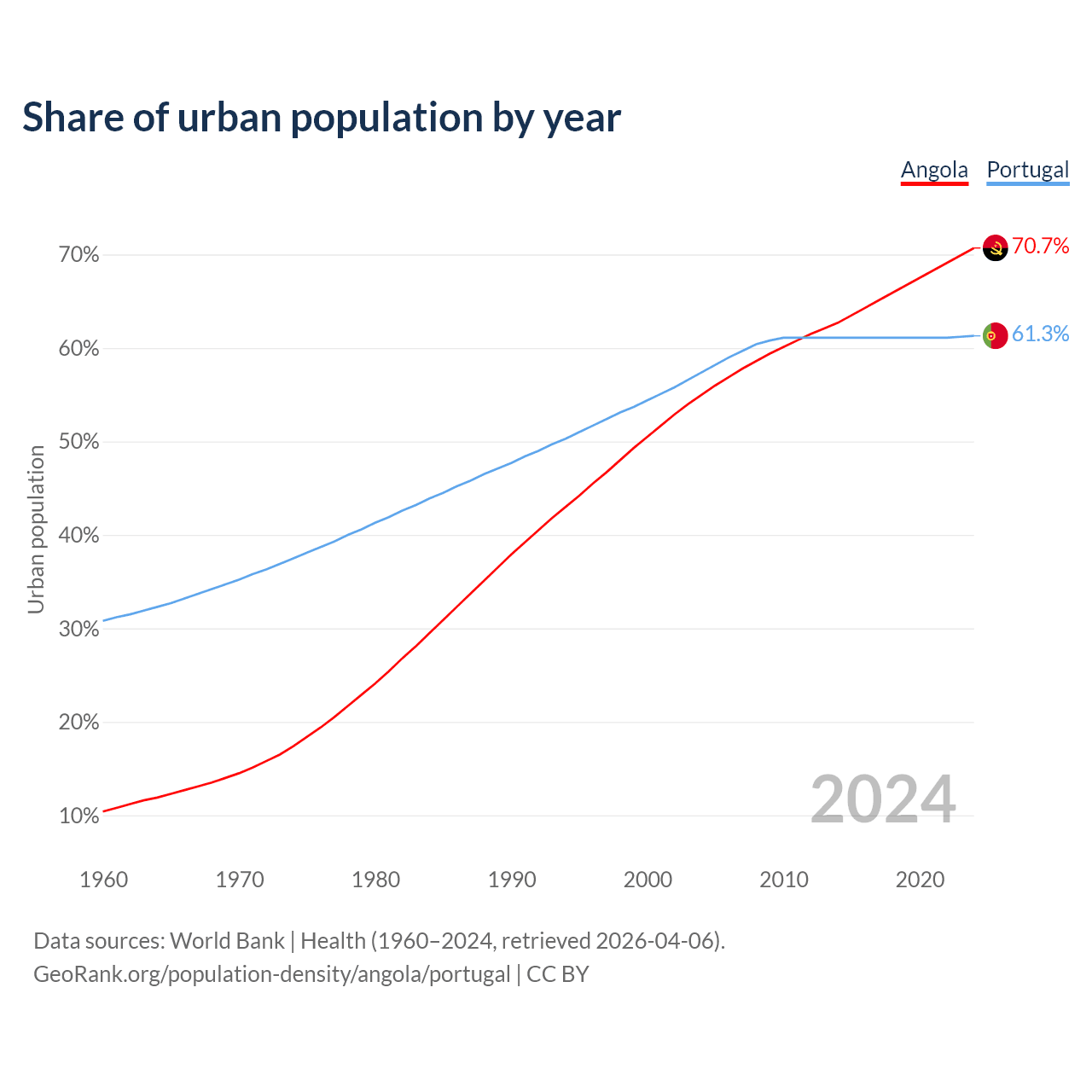 From 2004 to 2024, the share of urban population changed from 55% to 70.7% in Angola and from 57.4% to 61.3% in Portugal.