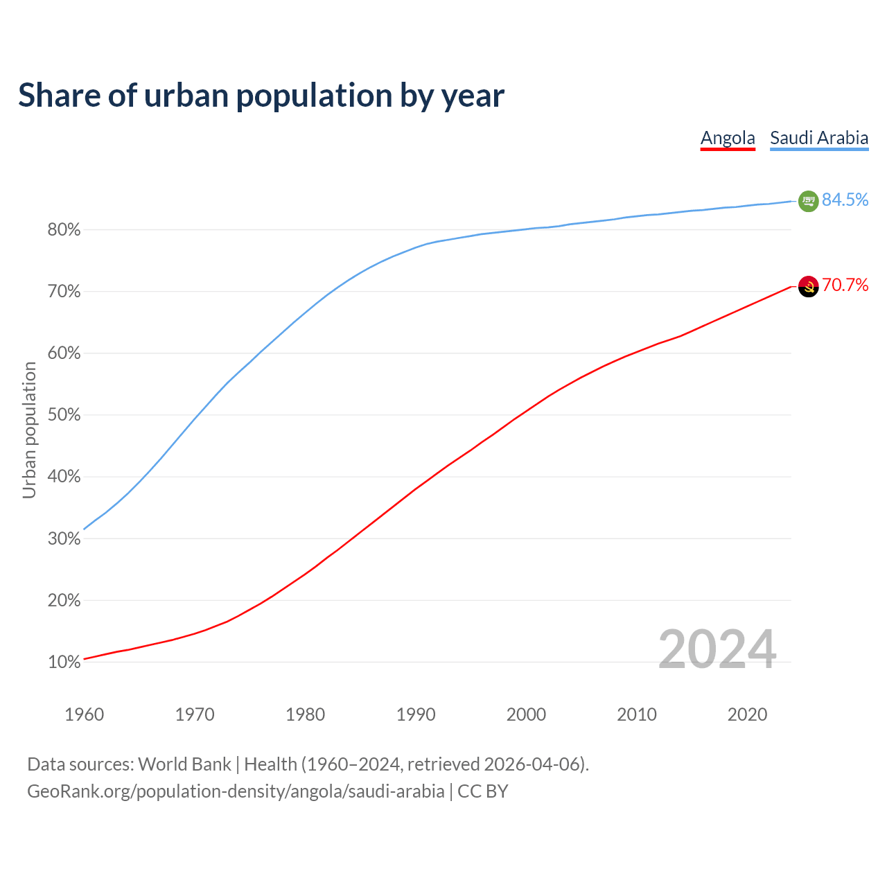 From 2004 to 2024, the share of urban population changed from 55% to 70.7% in Angola and from 80.8% to 84.5% in Saudi Arabia.