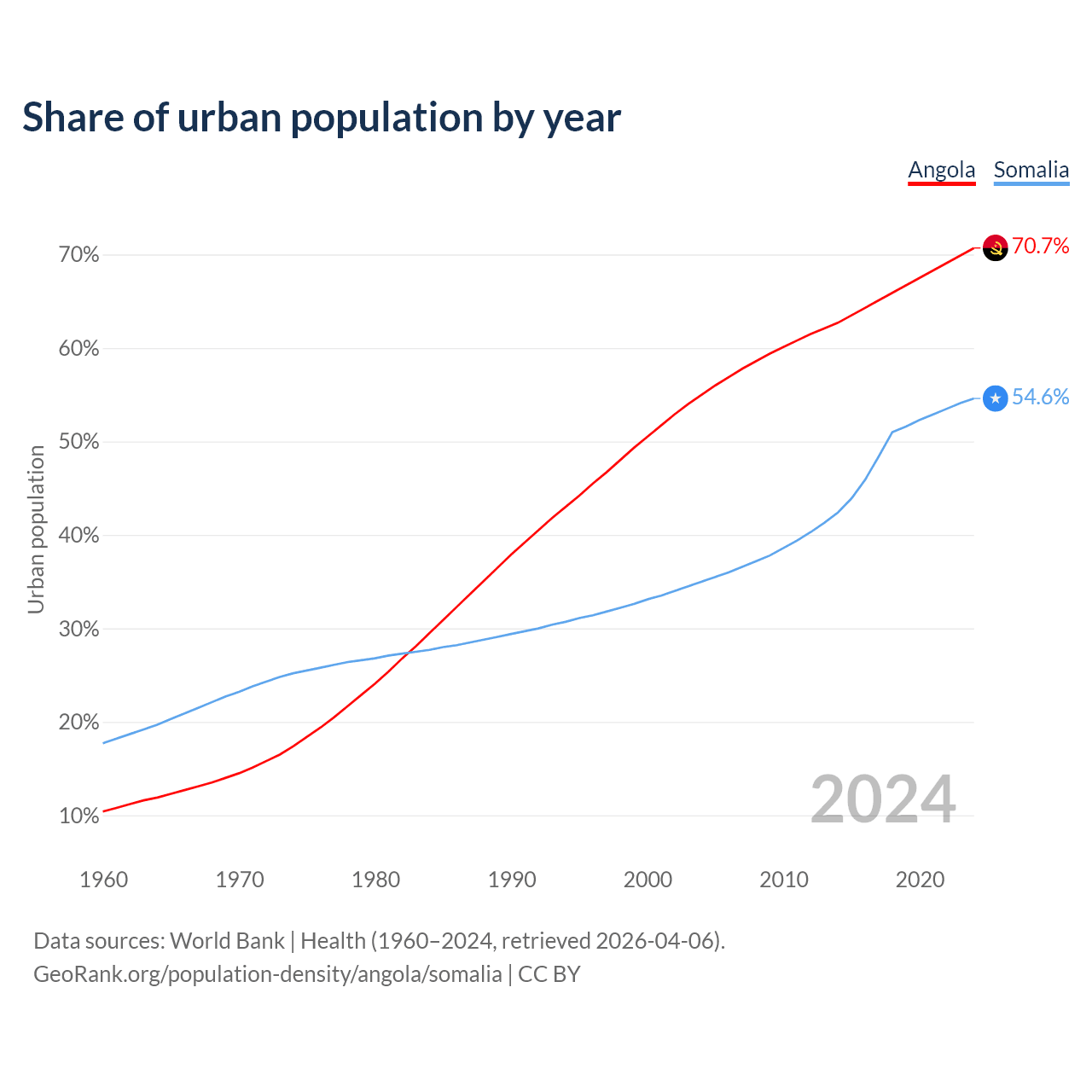 From 2004 to 2024, the share of urban population changed from 55% to 70.7% in Angola and from 35% to 54.6% in Somalia.