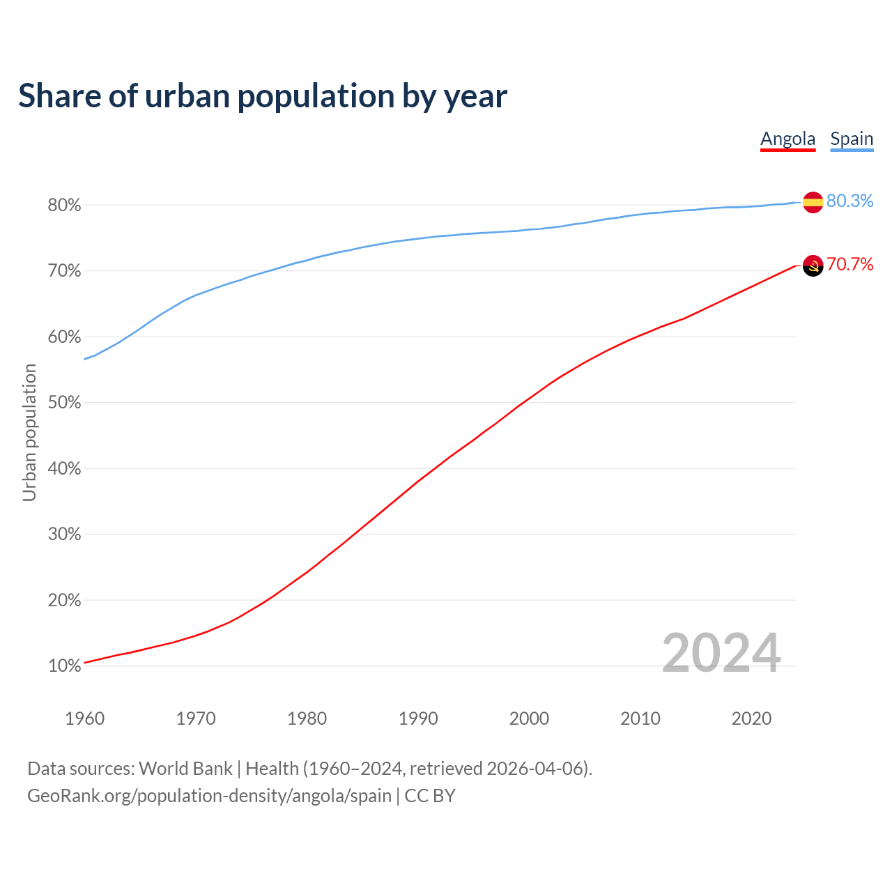 From 2004 to 2024, the share of urban population changed from 55% to 70.7% in Angola and from 77% to 80.3% in Spain.