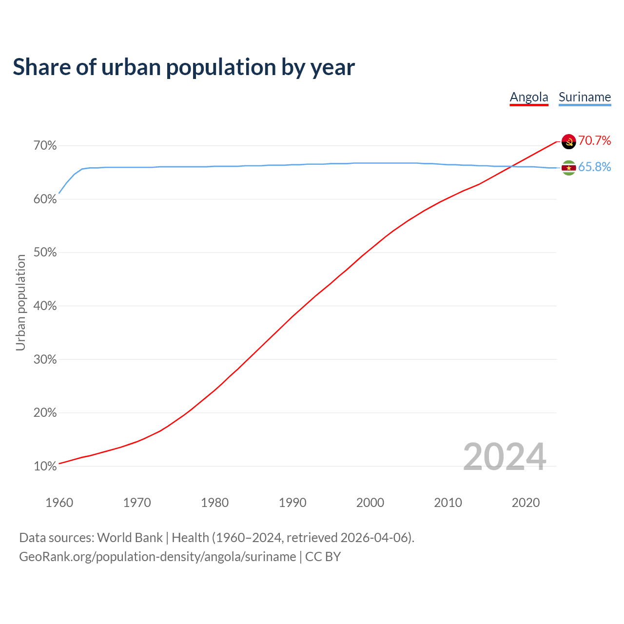 From 2004 to 2024, the share of urban population changed from 55% to 70.7% in Angola and from 66.7% to 65.8% in Suriname.