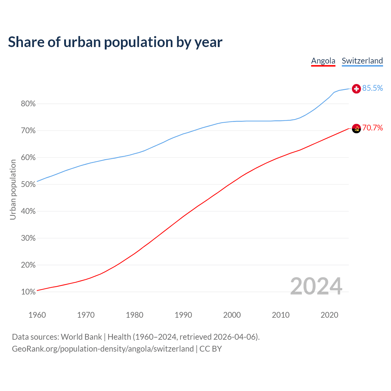 From 2004 to 2024, the share of urban population changed from 55% to 70.7% in Angola and from 73.5% to 85.5% in Switzerland.