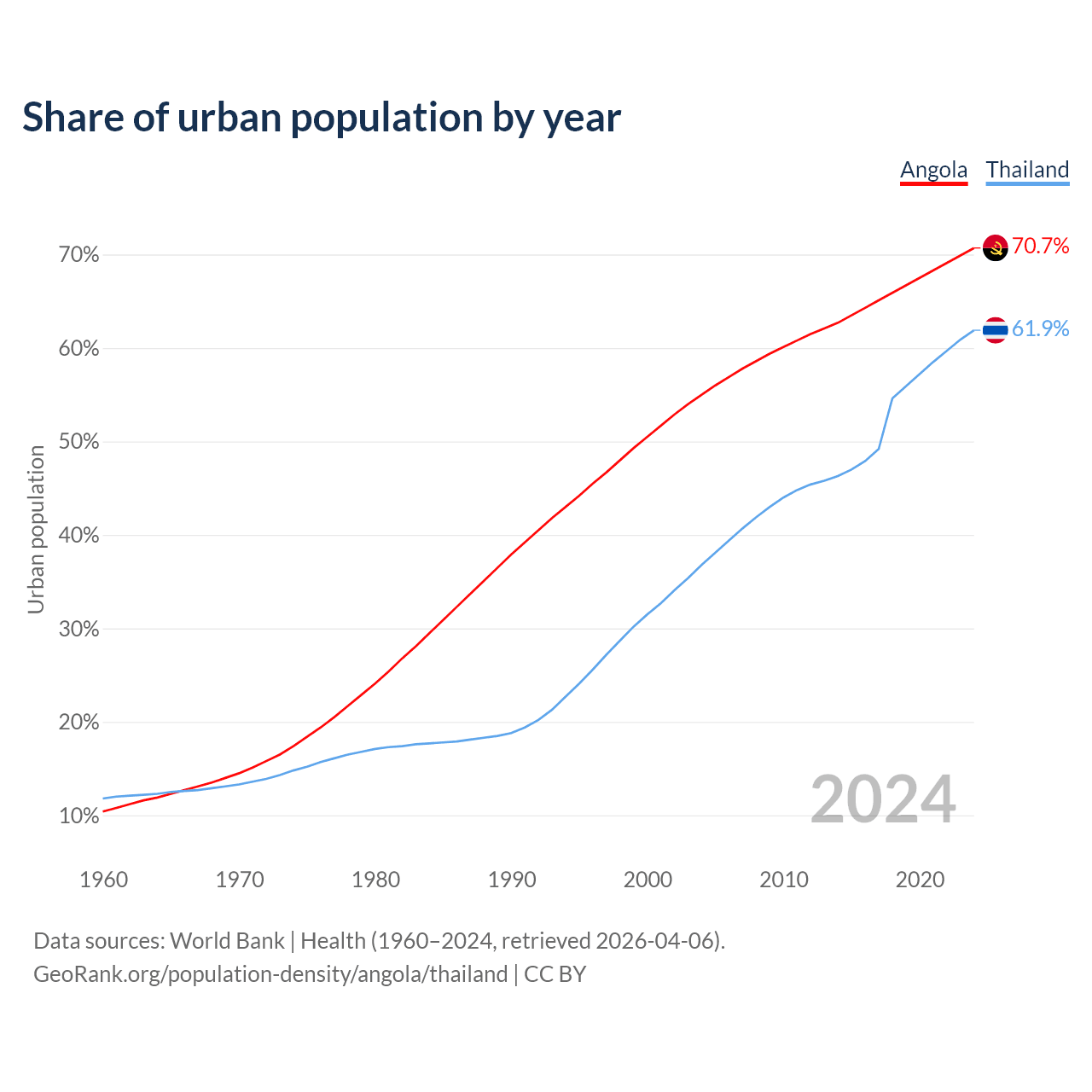 From 2004 to 2024, the share of urban population changed from 55% to 70.7% in Angola and from 36.8% to 61.9% in Thailand.