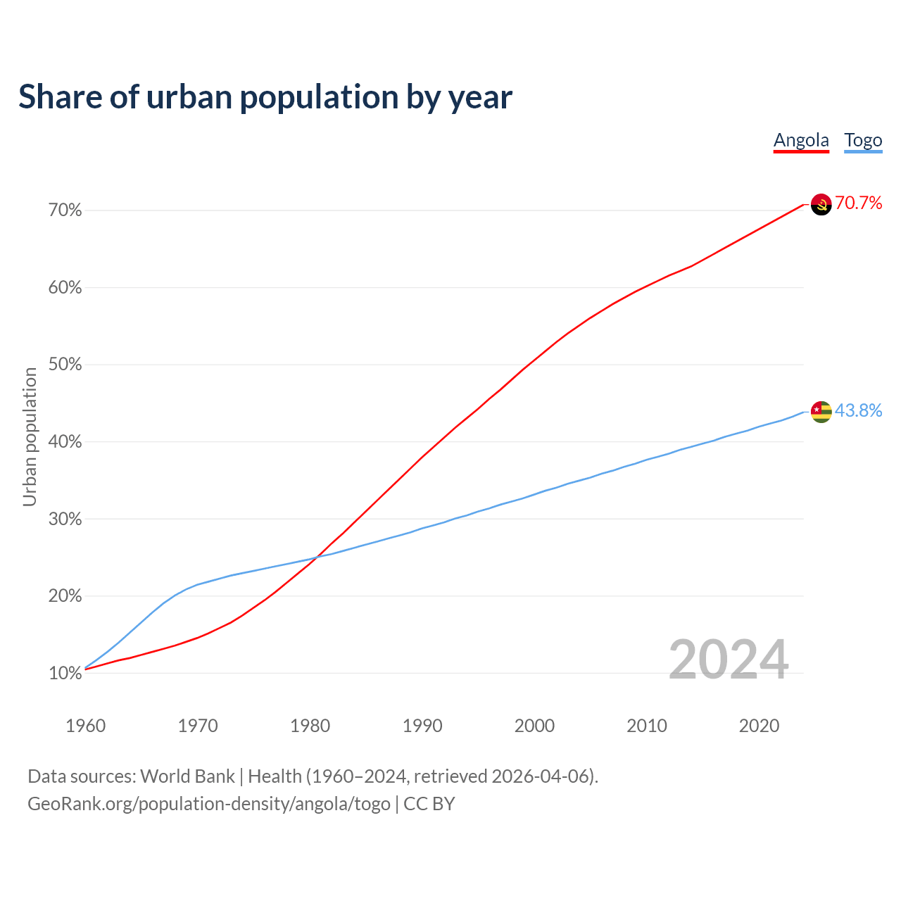 From 2004 to 2024, the share of urban population changed from 55% to 70.7% in Angola and from 34.9% to 43.8% in Togo.