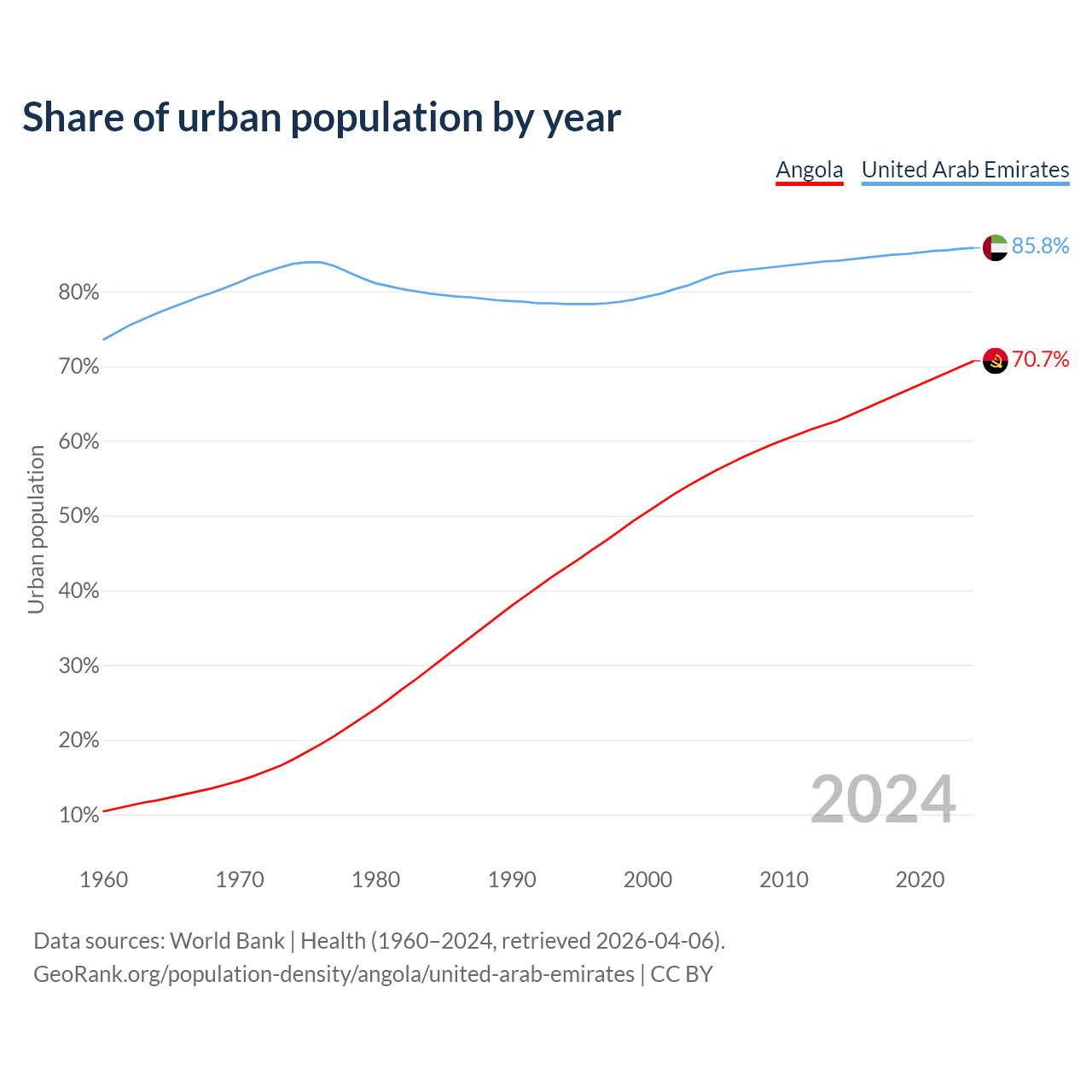 From 2004 to 2024, the share of urban population changed from 55% to 70.7% in Angola and from 81.5% to 85.8% in the United Arab Emirates.