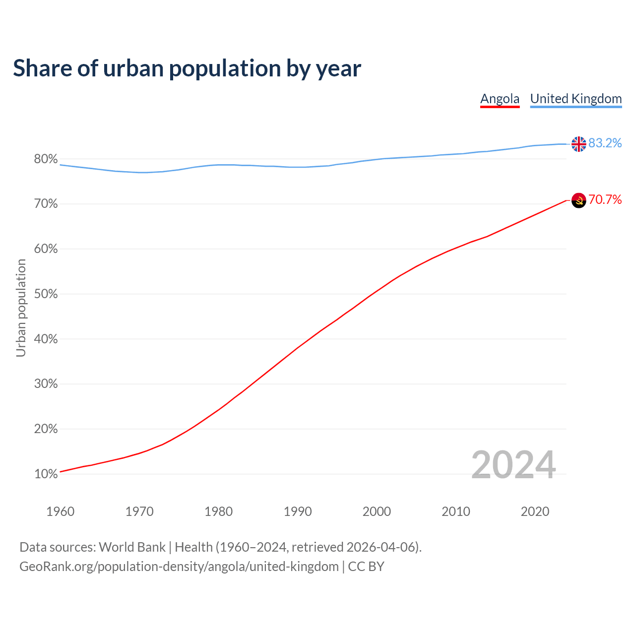 From 2004 to 2024, the share of urban population changed from 55% to 70.7% in Angola and from 80.3% to 83.2% in the United Kingdom.