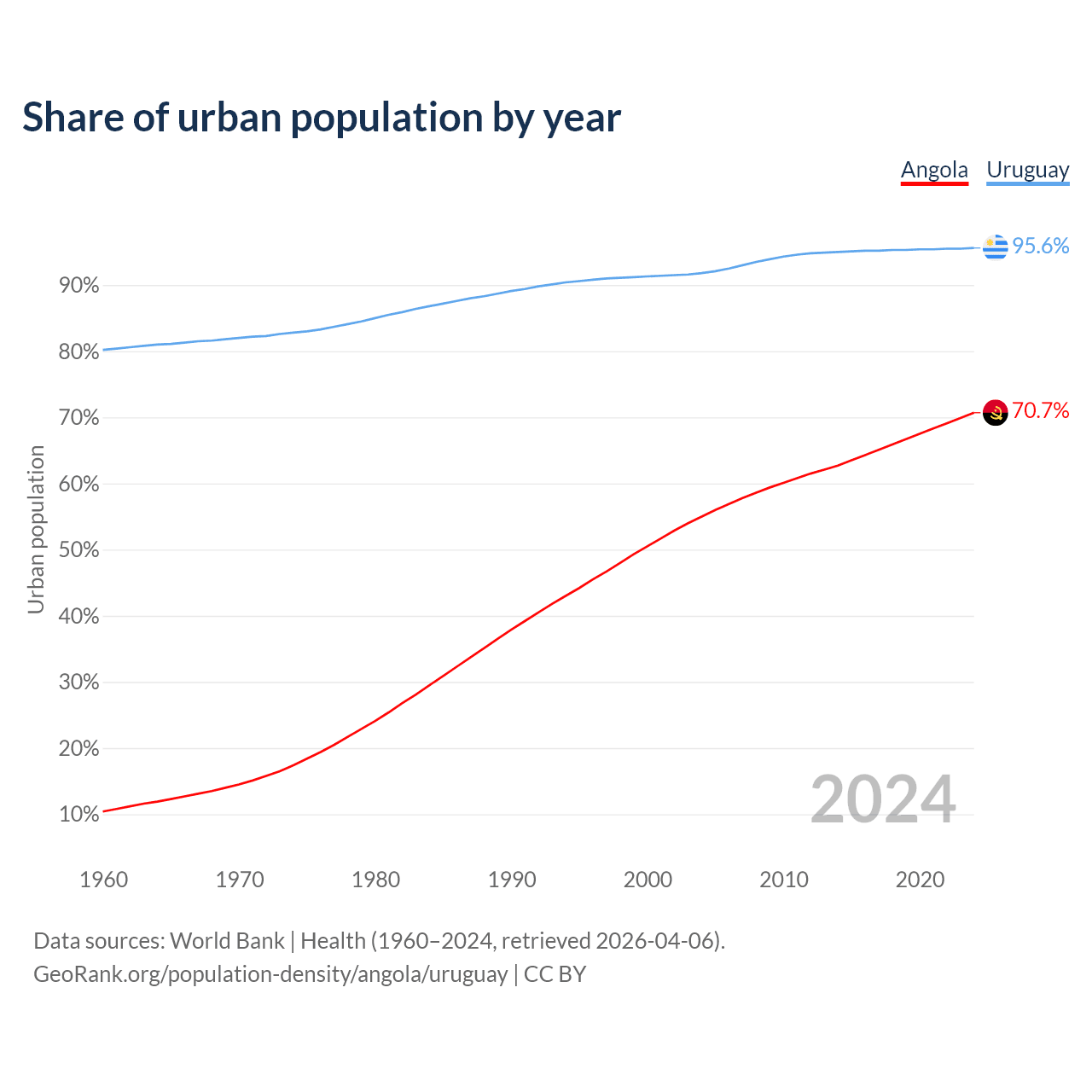 From 2004 to 2024, the share of urban population changed from 55% to 70.7% in Angola and from 91.8% to 95.6% in Uruguay.