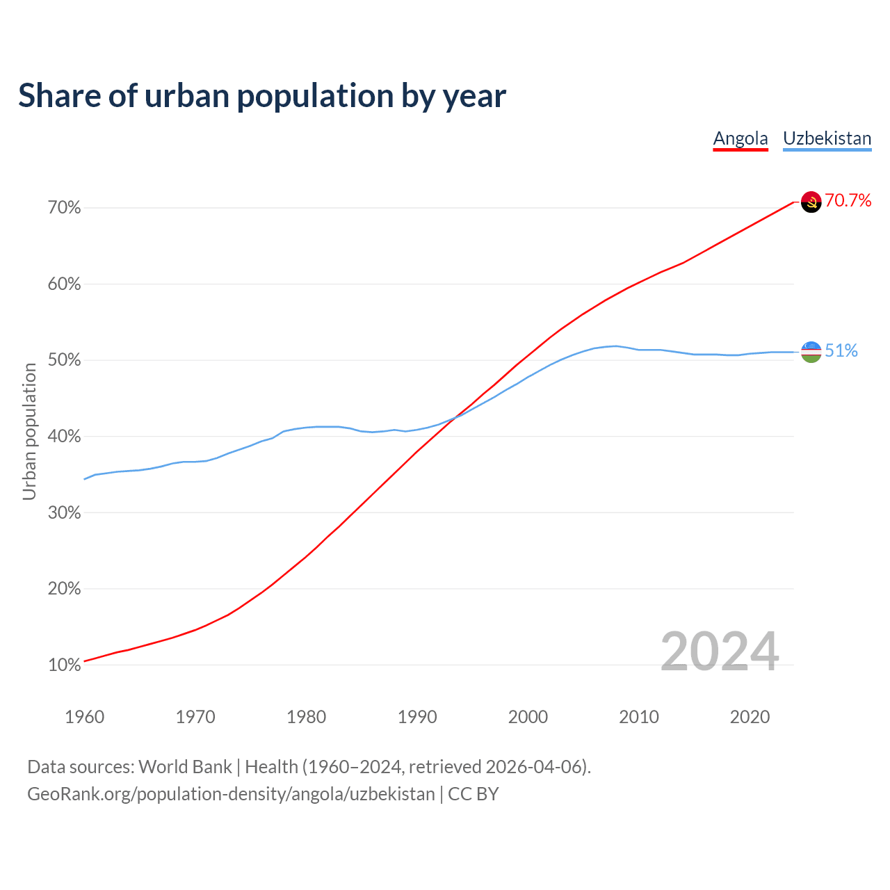 From 2004 to 2024, the share of urban population changed from 55% to 70.7% in Angola and from 50.6% to 51% in Uzbekistan.