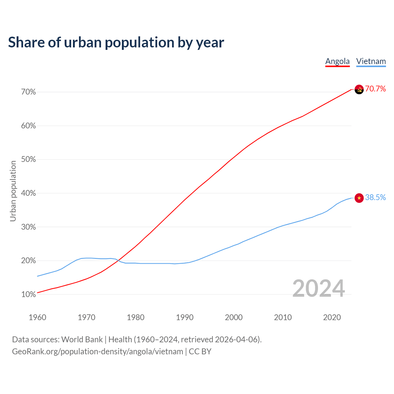 From 2004 to 2024, the share of urban population changed from 55% to 70.7% in Angola and from 26.8% to 38.5% in Vietnam.