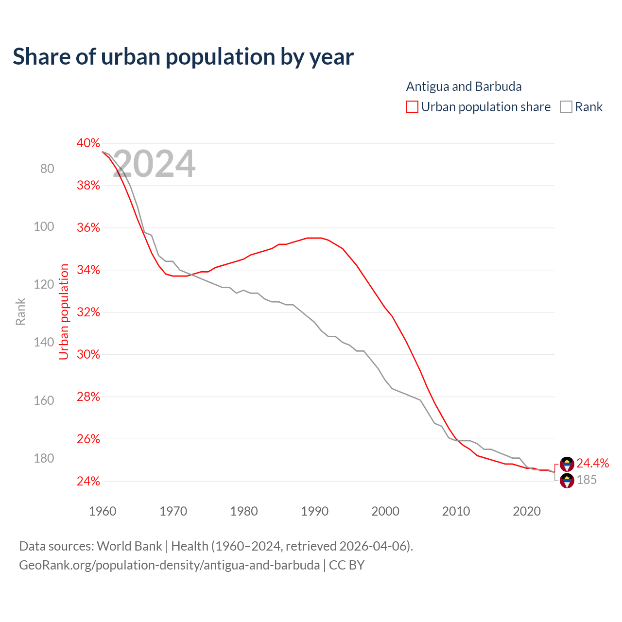 This chart shows the share of urban population in Antigua and Barbuda from 1960 to 2024: 39.6% lived in urban areas in 1960, 32.2% in 2000, and 24.4% in 2024.