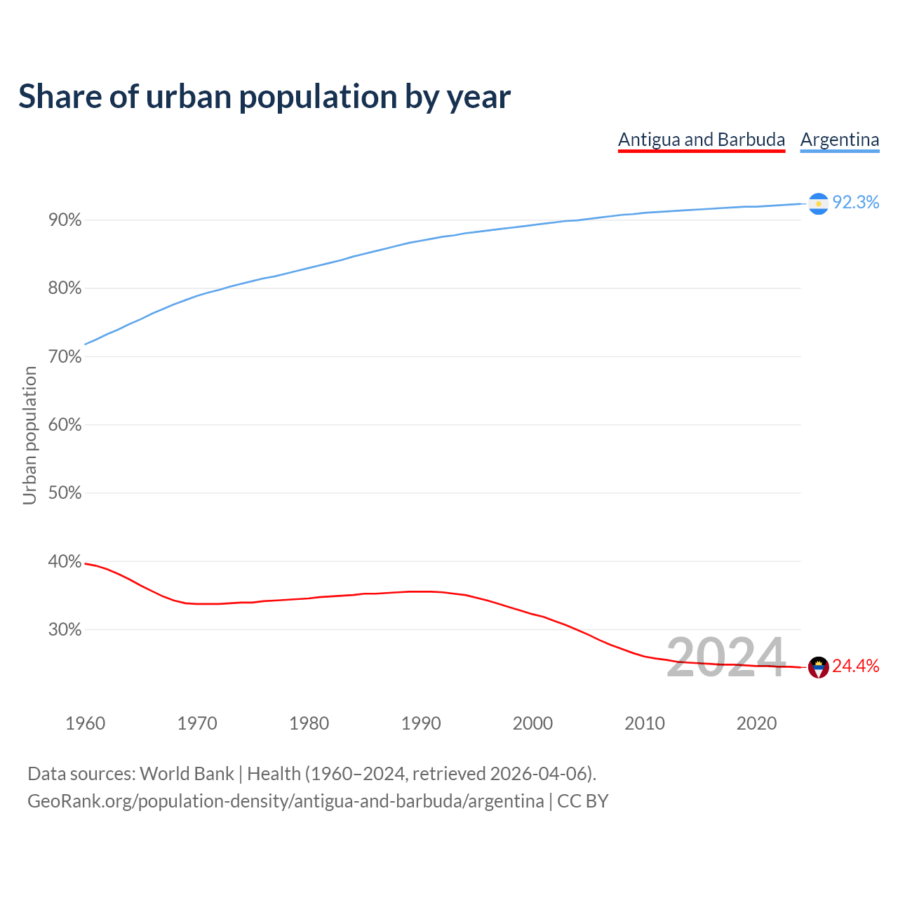 From 2004 to 2024, the share of urban population changed from 29.9% to 24.4% in Antigua and Barbuda and from 89.9% to 92.3% in Argentina.