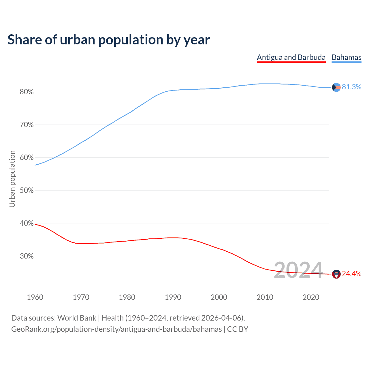 From 2004 to 2024, the share of urban population changed from 29.9% to 24.4% in Antigua and Barbuda and from 81.7% to 81.3% in the Bahamas.