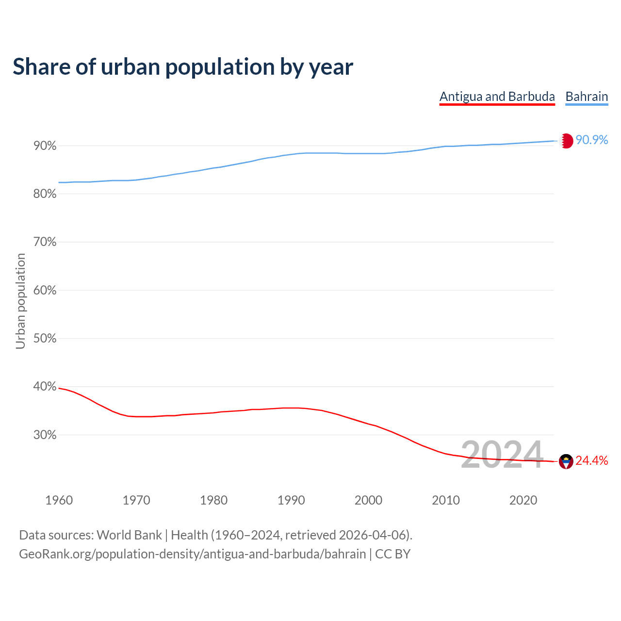 From 2004 to 2024, the share of urban population changed from 29.9% to 24.4% in Antigua and Barbuda and from 88.6% to 90.9% in Bahrain.