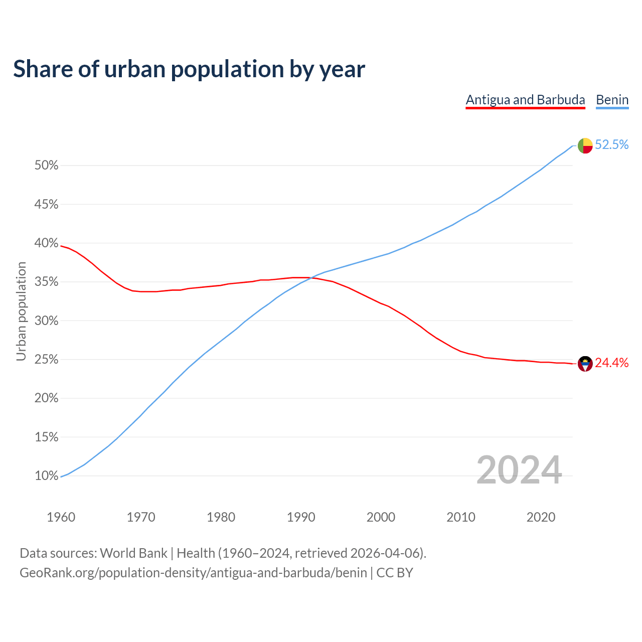 From 2004 to 2024, the share of urban population changed from 29.9% to 24.4% in Antigua and Barbuda and from 39.9% to 52.5% in Benin.