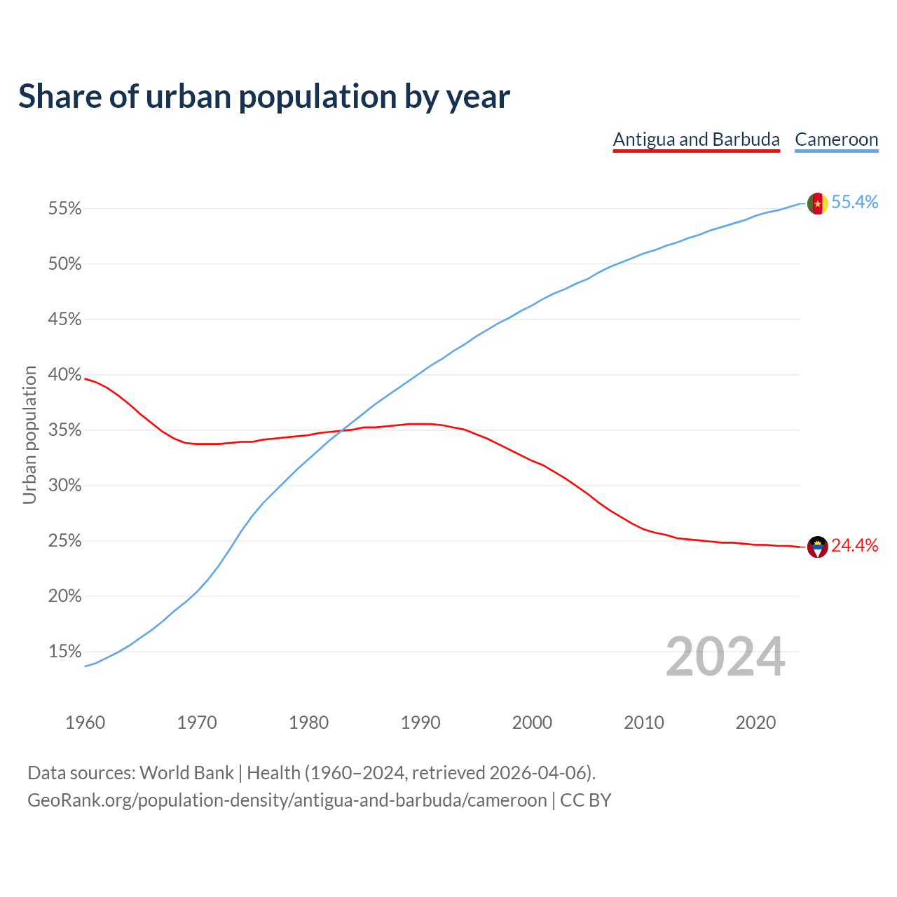 From 2004 to 2024, the share of urban population changed from 29.9% to 24.4% in Antigua and Barbuda and from 48.2% to 55.4% in Cameroon.