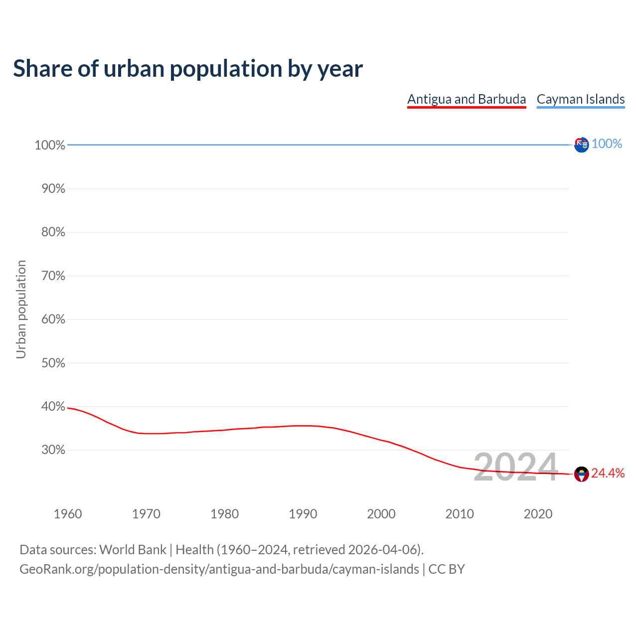 From 2004 to 2024, the share of urban population changed from 29.9% to 24.4% in Antigua and Barbuda and from 100% to 100% in the Cayman Islands.