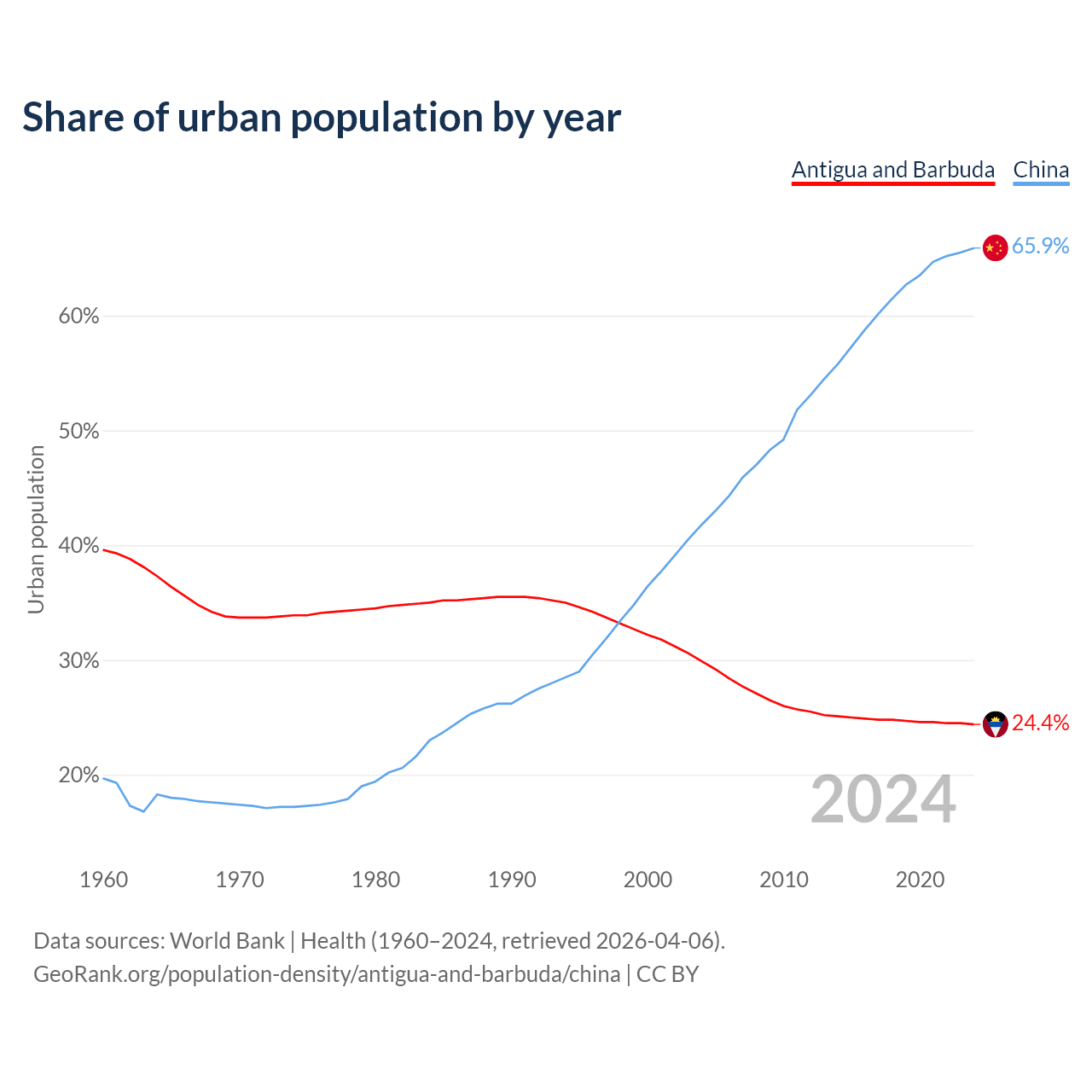 From 2004 to 2024, the share of urban population changed from 29.9% to 24.4% in Antigua and Barbuda and from 41.8% to 65.9% in China.