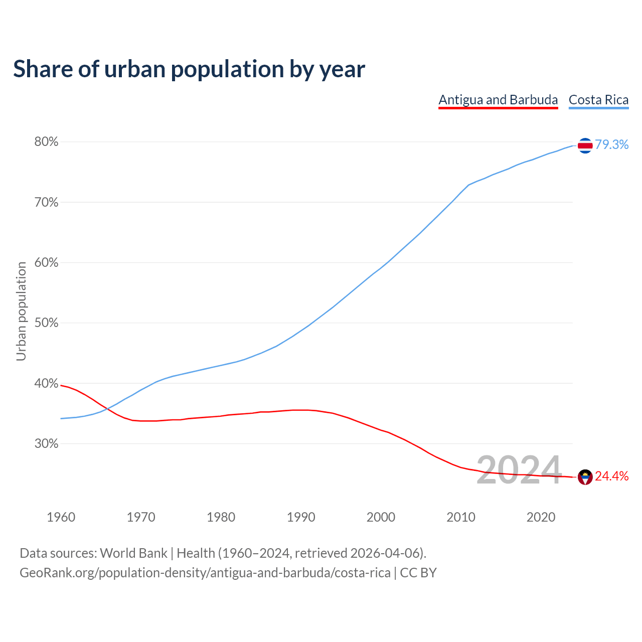 From 2004 to 2024, the share of urban population changed from 29.9% to 24.4% in Antigua and Barbuda and from 63.7% to 79.3% in Costa Rica.