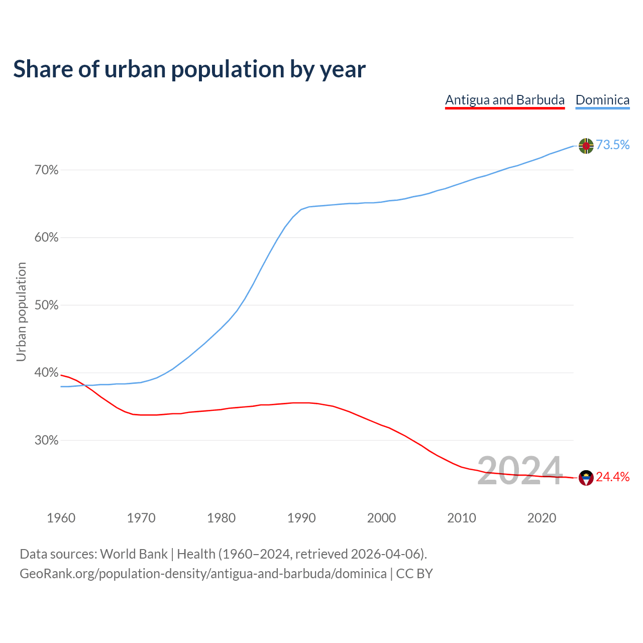 From 2004 to 2024, the share of urban population changed from 29.9% to 24.4% in Antigua and Barbuda and from 66% to 73.5% in Dominica.