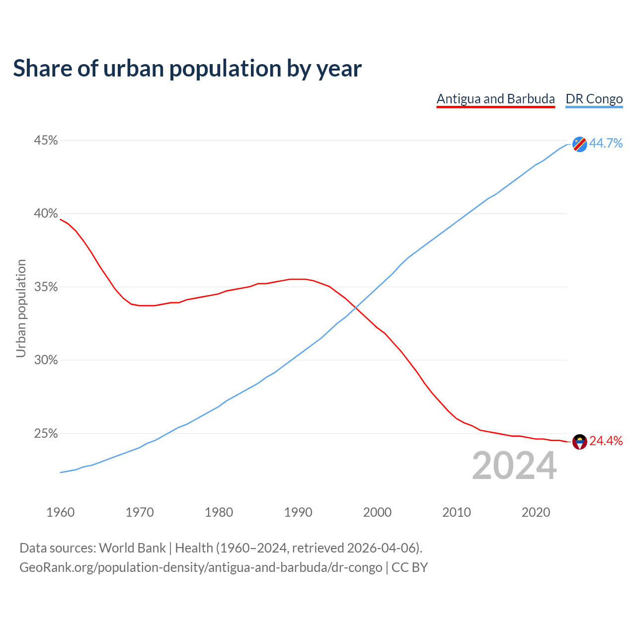 From 2004 to 2024, the share of urban population changed from 29.9% to 24.4% in Antigua and Barbuda and from 37% to 44.7% in the DR Congo.