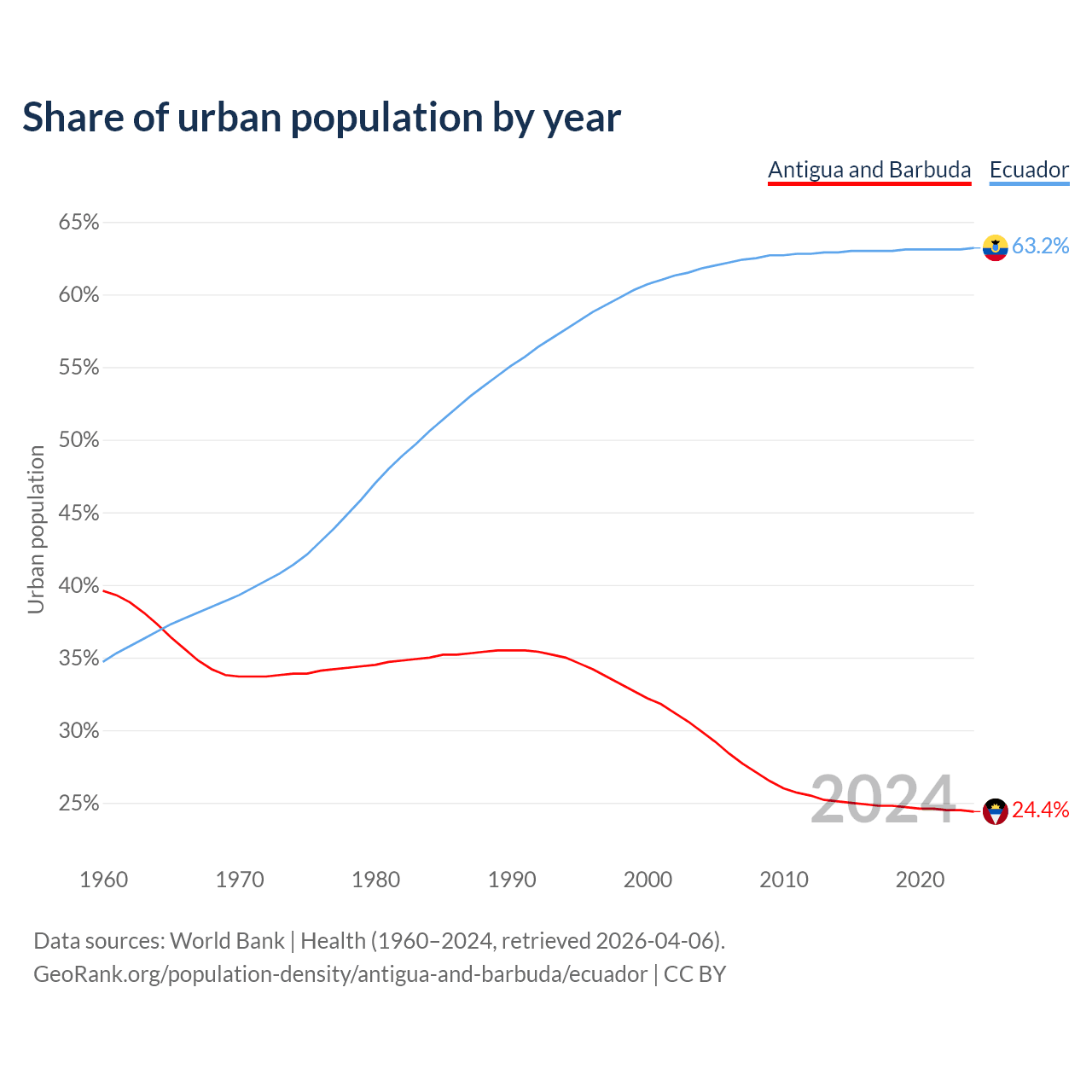 From 2004 to 2024, the share of urban population changed from 29.9% to 24.4% in Antigua and Barbuda and from 61.8% to 63.2% in Ecuador.