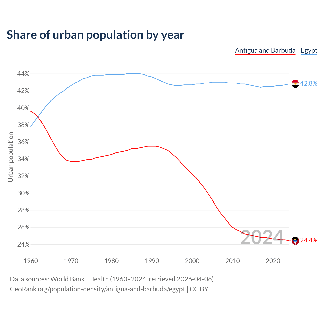 From 2004 to 2024, the share of urban population changed from 29.9% to 24.4% in Antigua and Barbuda and from 42.9% to 42.8% in Egypt.