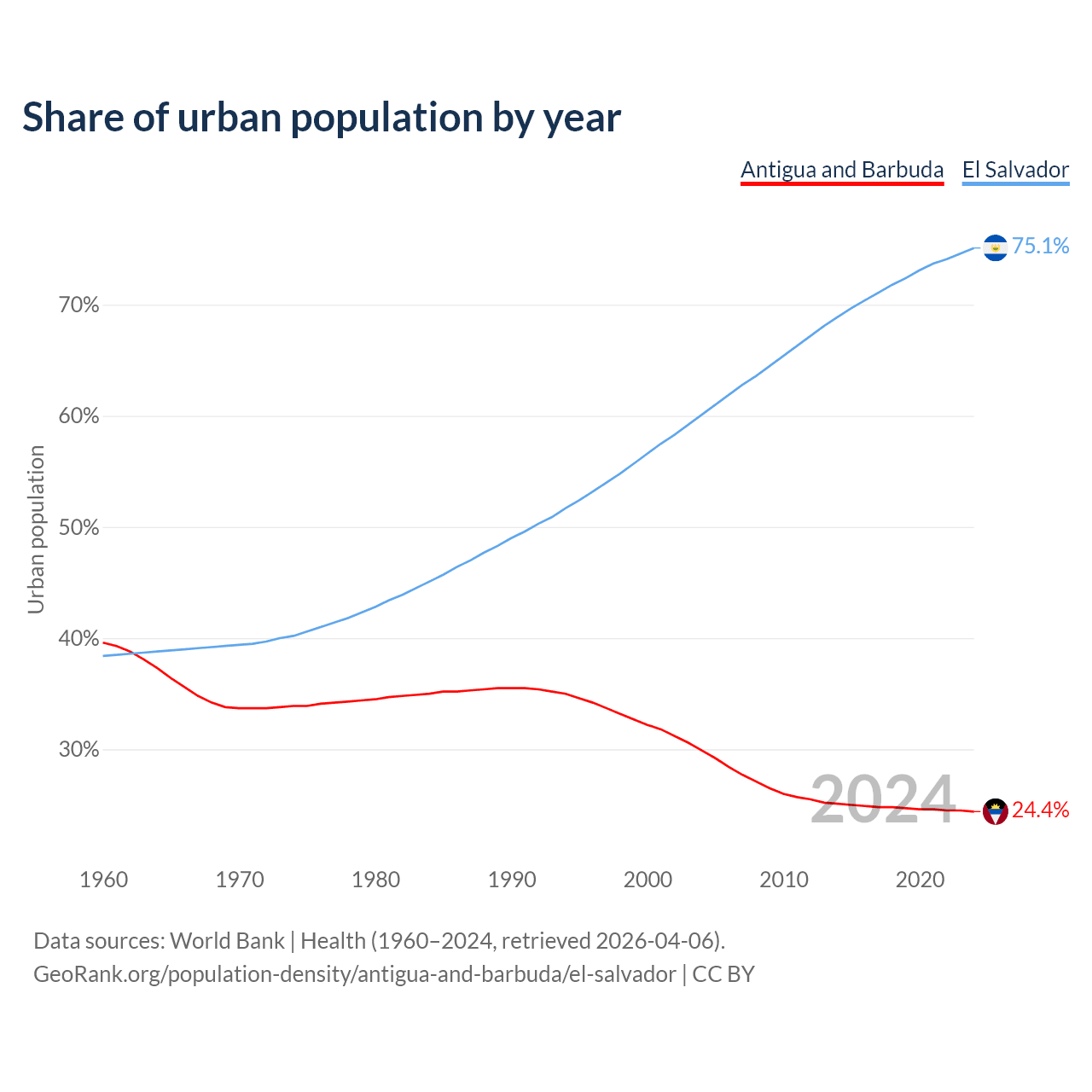From 2004 to 2024, the share of urban population changed from 29.9% to 24.4% in Antigua and Barbuda and from 60.1% to 75.1% in El Salvador.