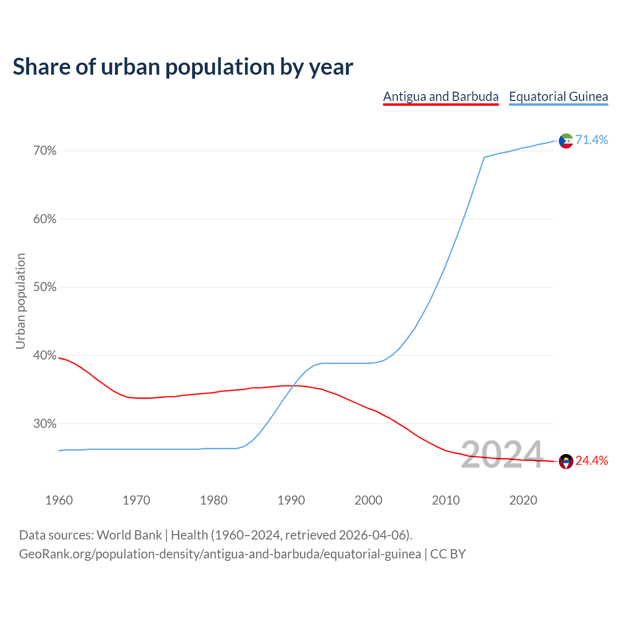 From 2004 to 2024, the share of urban population changed from 29.9% to 24.4% in Antigua and Barbuda and from 40.9% to 71.4% in Equatorial Guinea.