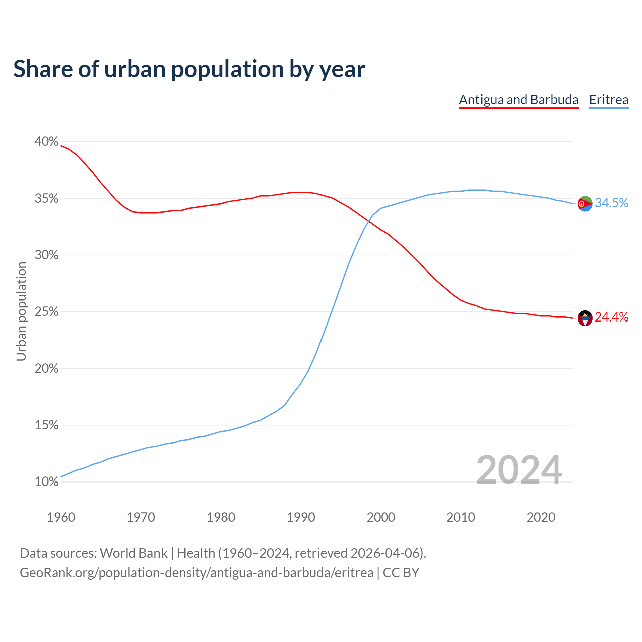 From 2004 to 2024, the share of urban population changed from 29.9% to 24.4% in Antigua and Barbuda and from 34.9% to 34.5% in Eritrea.