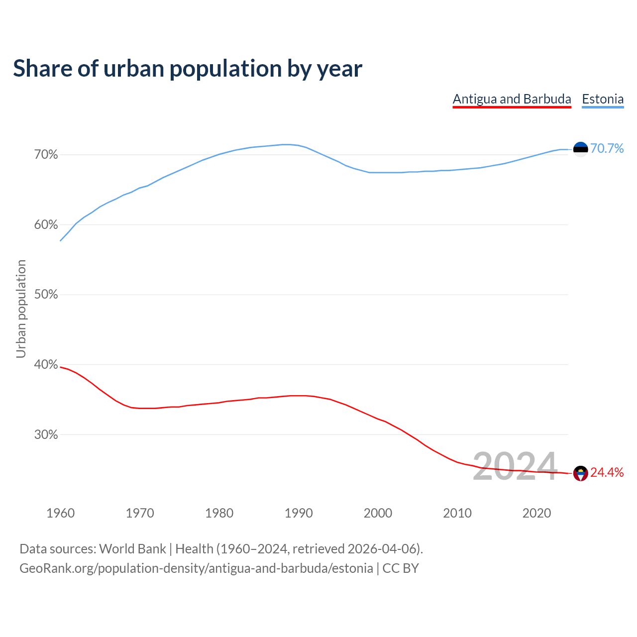 From 2004 to 2024, the share of urban population changed from 29.9% to 24.4% in Antigua and Barbuda and from 67.5% to 70.7% in Estonia.