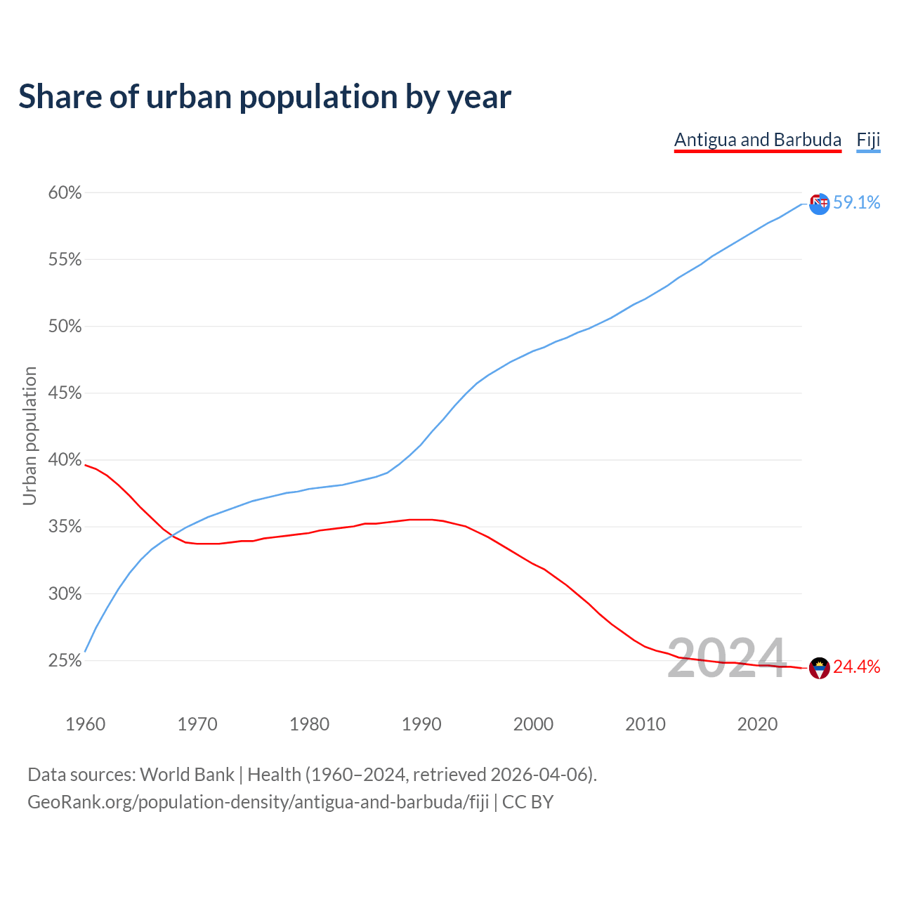 From 2004 to 2024, the share of urban population changed from 29.9% to 24.4% in Antigua and Barbuda and from 49.5% to 59.1% in Fiji.