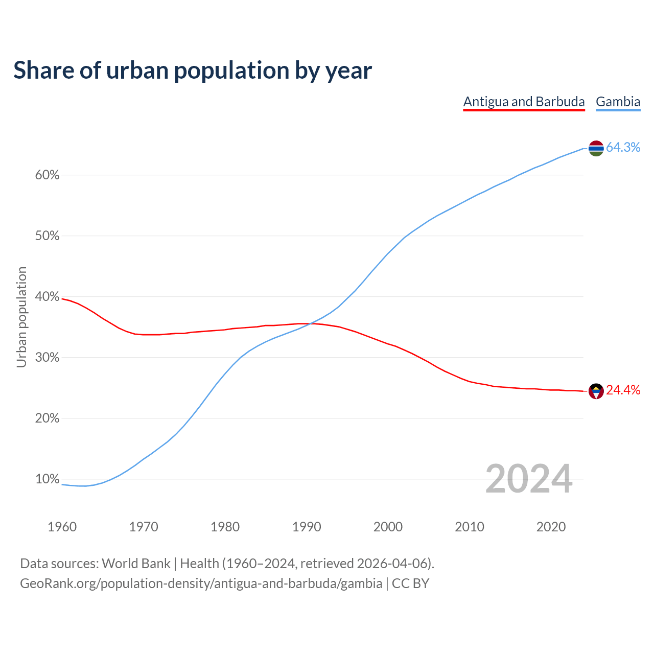 From 2004 to 2024, the share of urban population changed from 29.9% to 24.4% in Antigua and Barbuda and from 51.5% to 64.3% in the Gambia.