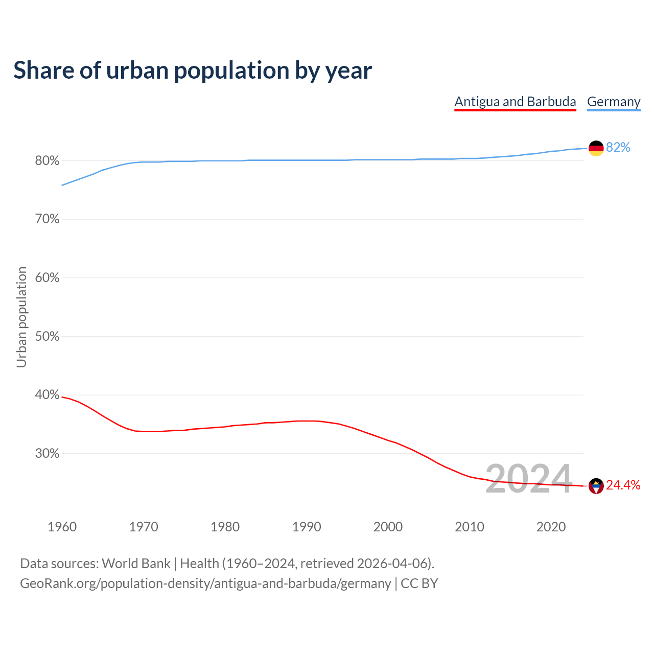 From 2004 to 2024, the share of urban population changed from 29.9% to 24.4% in Antigua and Barbuda and from 80.2% to 82% in Germany.
