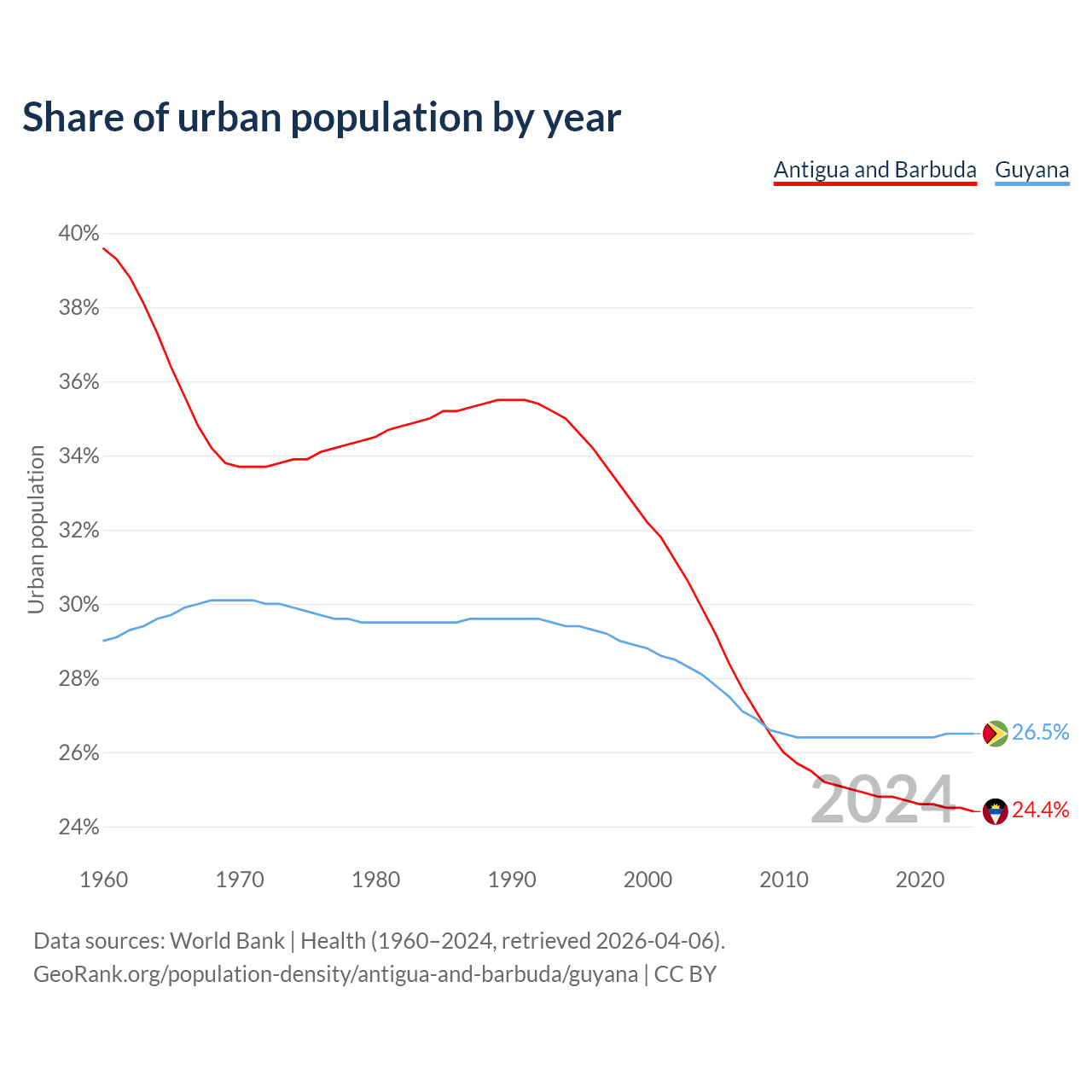 From 2004 to 2024, the share of urban population changed from 29.9% to 24.4% in Antigua and Barbuda and from 28.1% to 26.5% in Guyana.