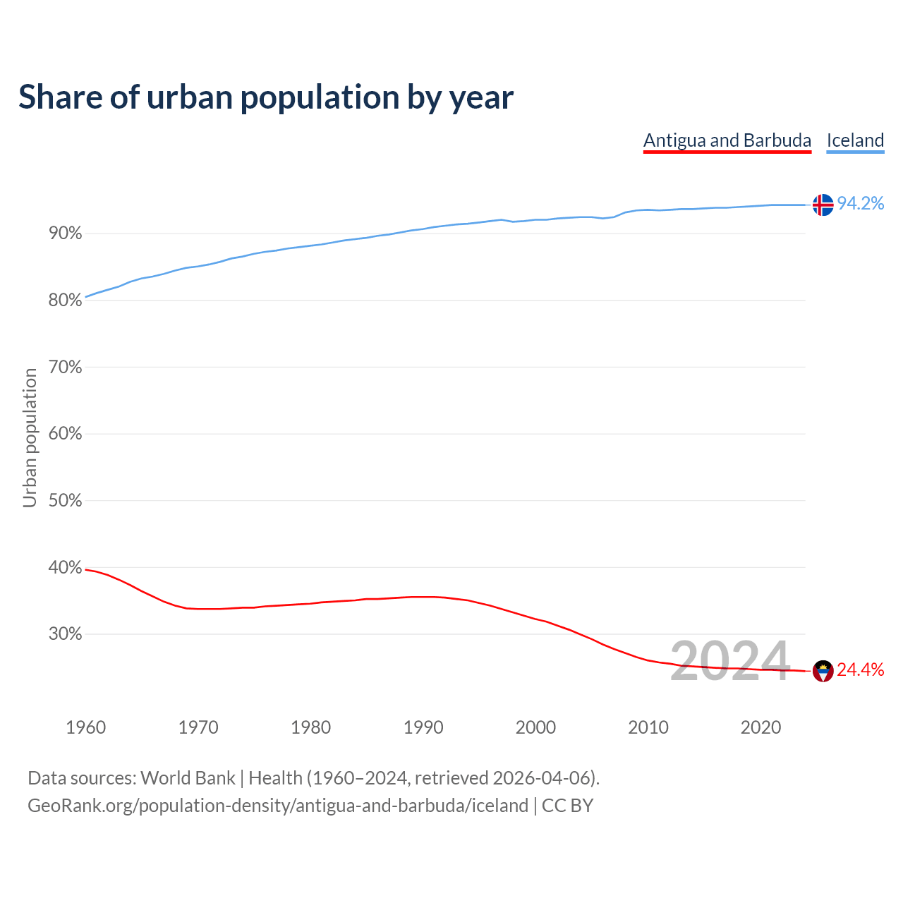 From 2004 to 2024, the share of urban population changed from 29.9% to 24.4% in Antigua and Barbuda and from 92.4% to 94.2% in Iceland.
