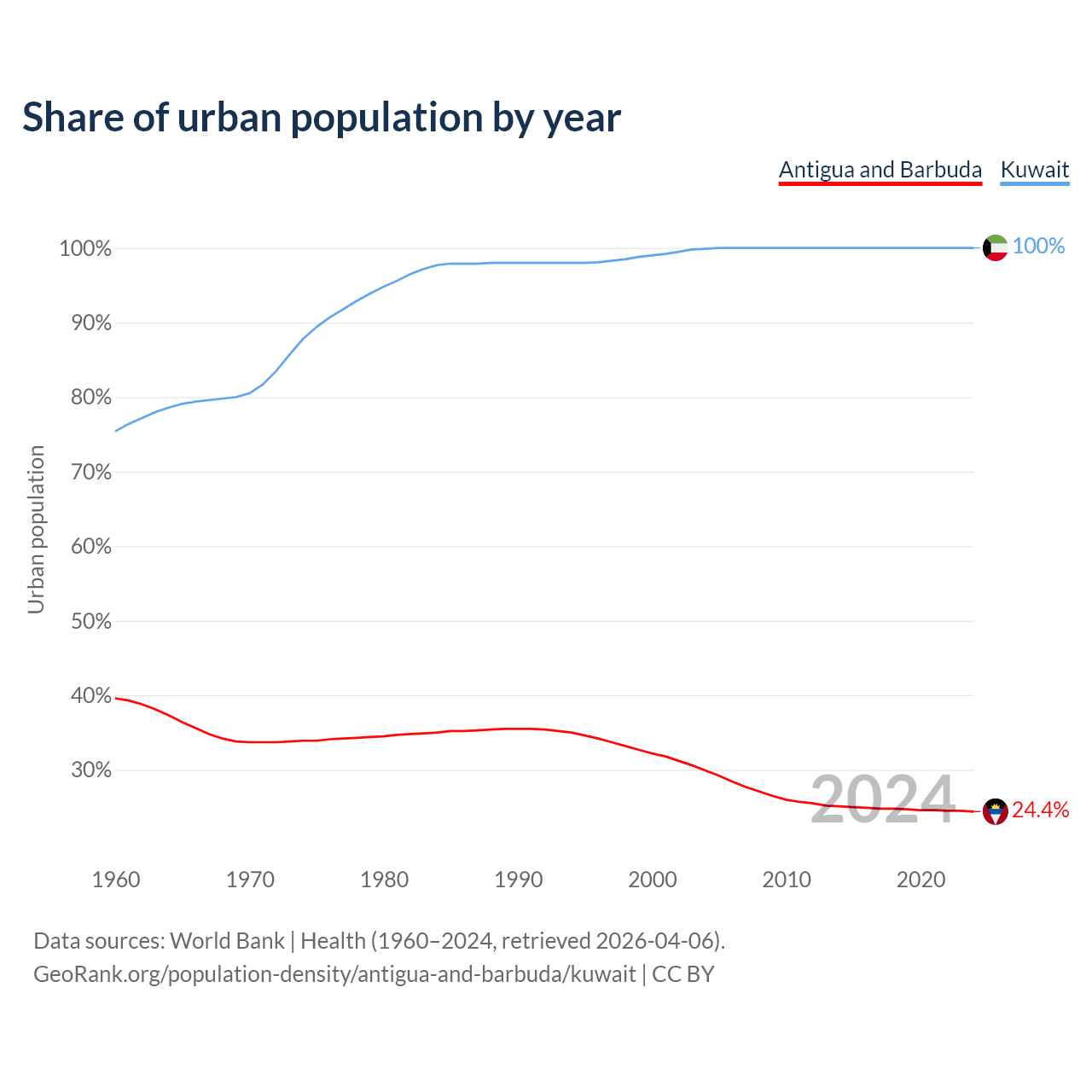 From 2004 to 2024, the share of urban population changed from 29.9% to 24.4% in Antigua and Barbuda and from 99.9% to 100% in Kuwait.