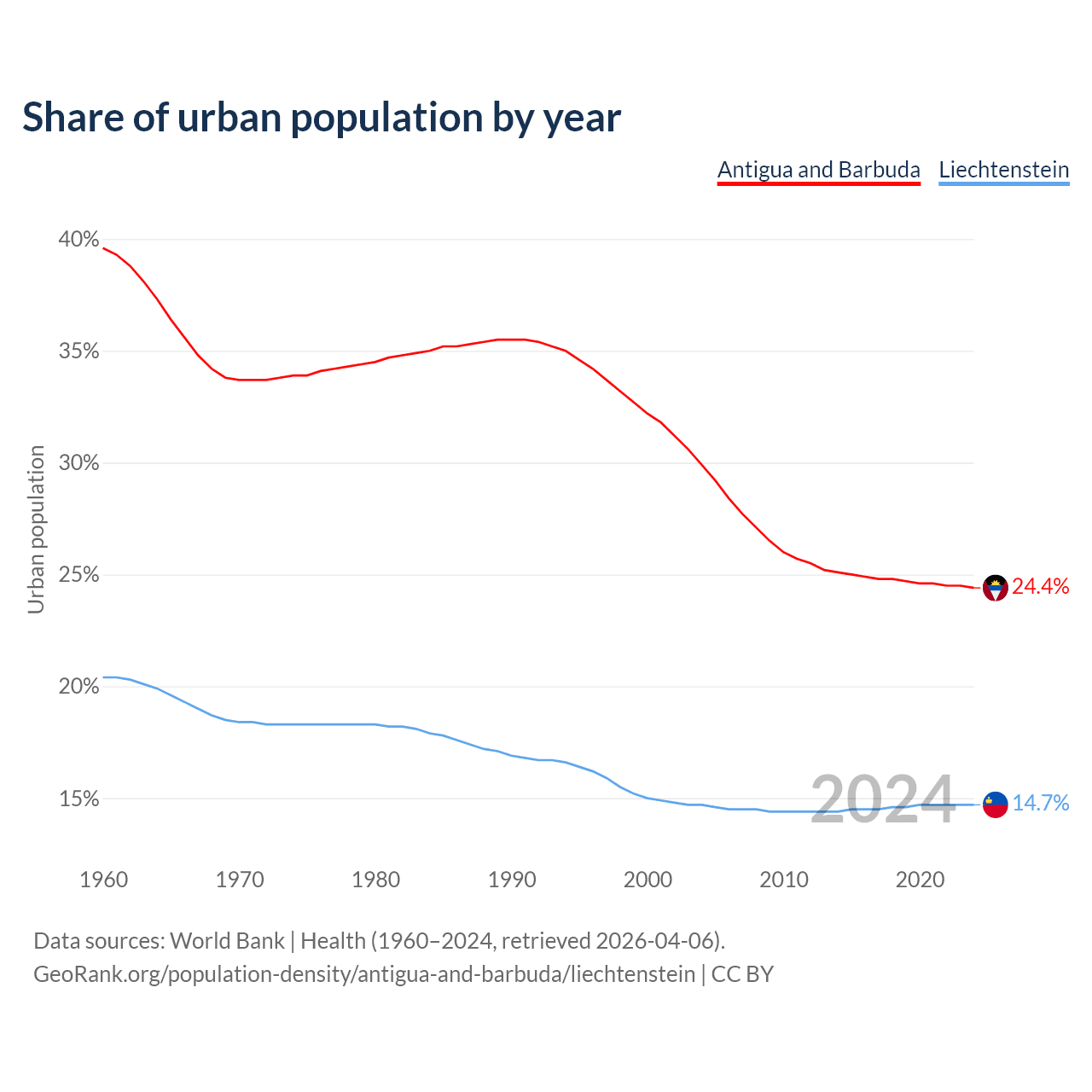 From 2004 to 2024, the share of urban population changed from 29.9% to 24.4% in Antigua and Barbuda and from 14.7% to 14.7% in Liechtenstein.