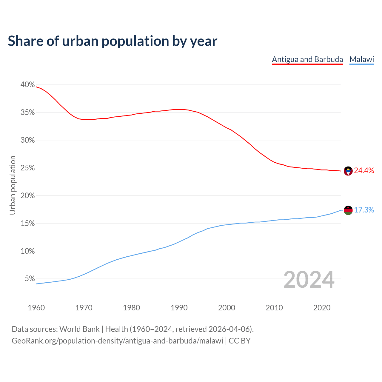 From 2004 to 2024, the share of urban population changed from 29.9% to 24.4% in Antigua and Barbuda and from 15% to 17.3% in Malawi.
