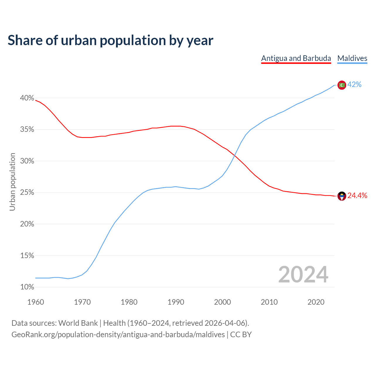 From 2004 to 2024, the share of urban population changed from 29.9% to 24.4% in Antigua and Barbuda and from 32.9% to 42% in Maldives.
