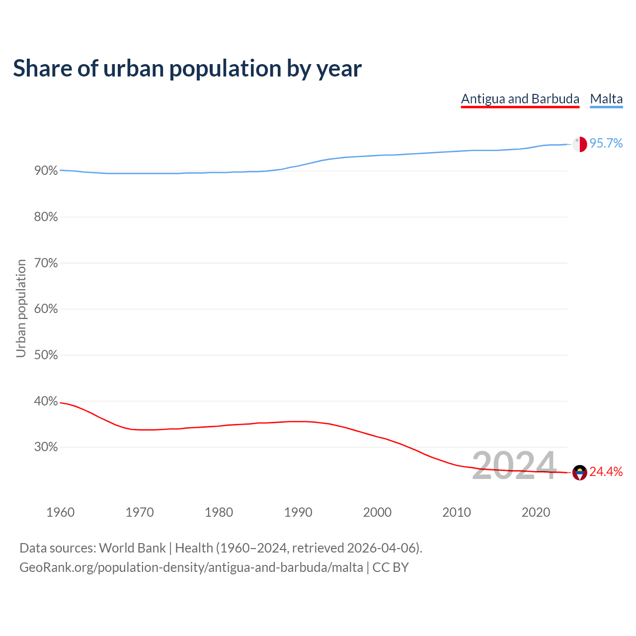 From 2004 to 2024, the share of urban population changed from 29.9% to 24.4% in Antigua and Barbuda and from 93.6% to 95.7% in Malta.