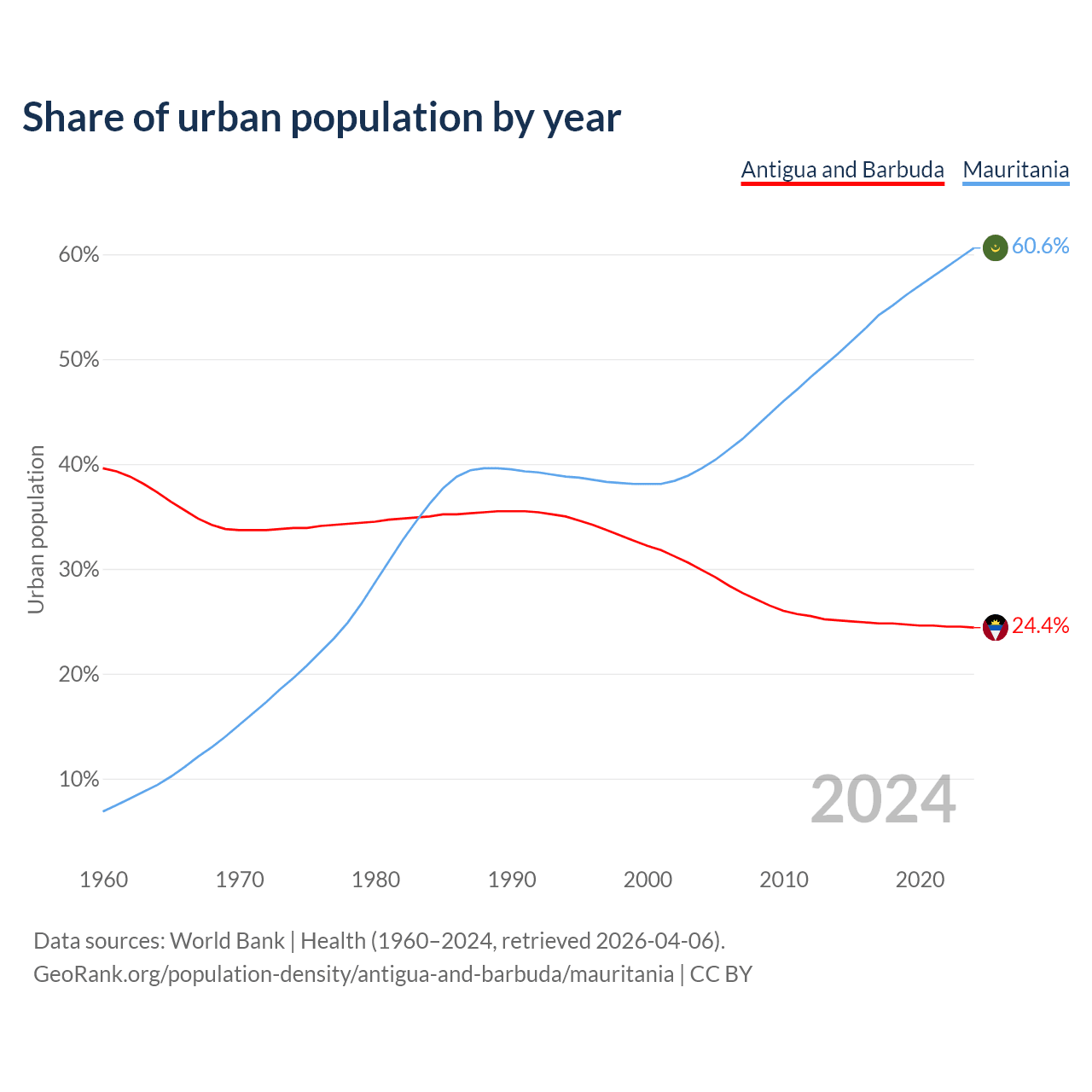 From 2004 to 2024, the share of urban population changed from 29.9% to 24.4% in Antigua and Barbuda and from 39.6% to 60.6% in Mauritania.