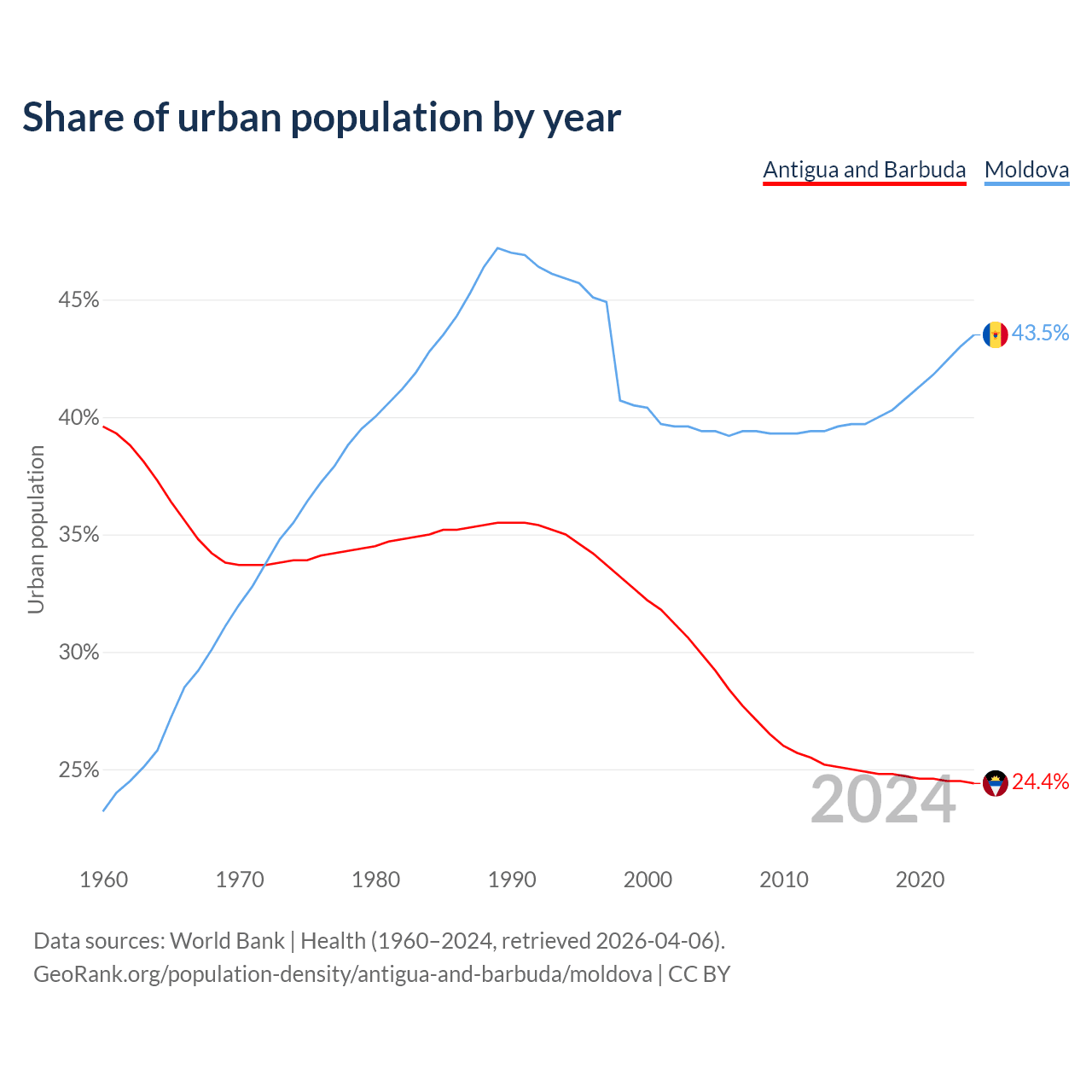 From 2004 to 2024, the share of urban population changed from 29.9% to 24.4% in Antigua and Barbuda and from 39.4% to 43.5% in Moldova.
