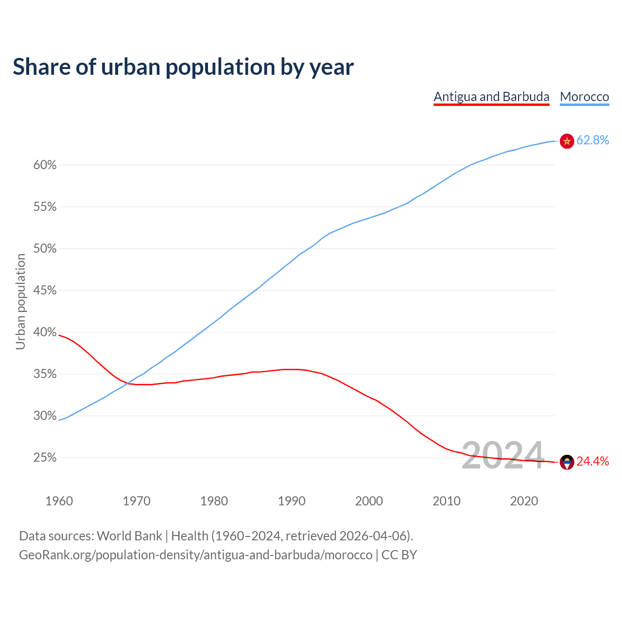 From 2004 to 2024, the share of urban population changed from 29.9% to 24.4% in Antigua and Barbuda and from 55% to 62.8% in Morocco.