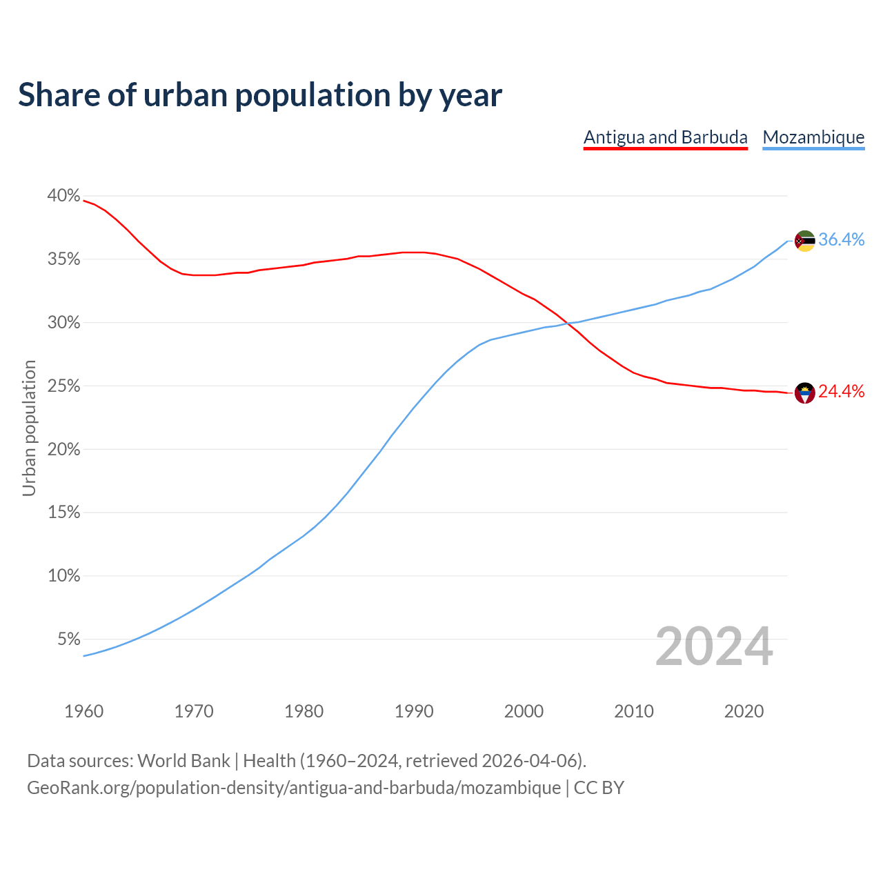From 2004 to 2024, the share of urban population changed from 29.9% to 24.4% in Antigua and Barbuda and from 29.9% to 36.4% in Mozambique.