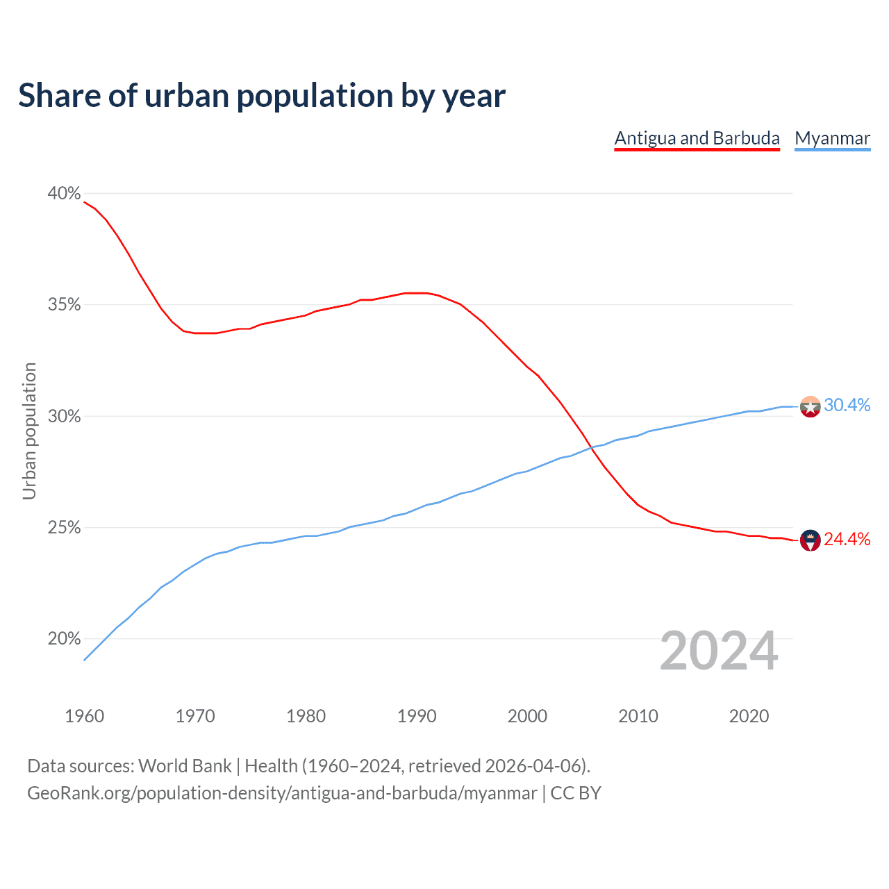 From 2004 to 2024, the share of urban population changed from 29.9% to 24.4% in Antigua and Barbuda and from 28.2% to 30.4% in Myanmar.