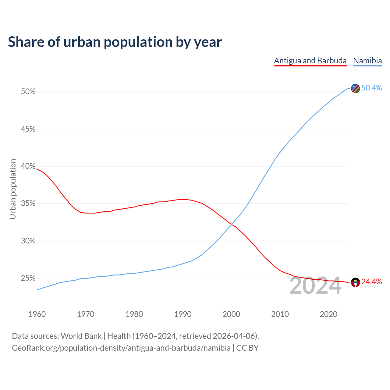 From 2004 to 2024, the share of urban population changed from 29.9% to 24.4% in Antigua and Barbuda and from 35.5% to 50.4% in Namibia.