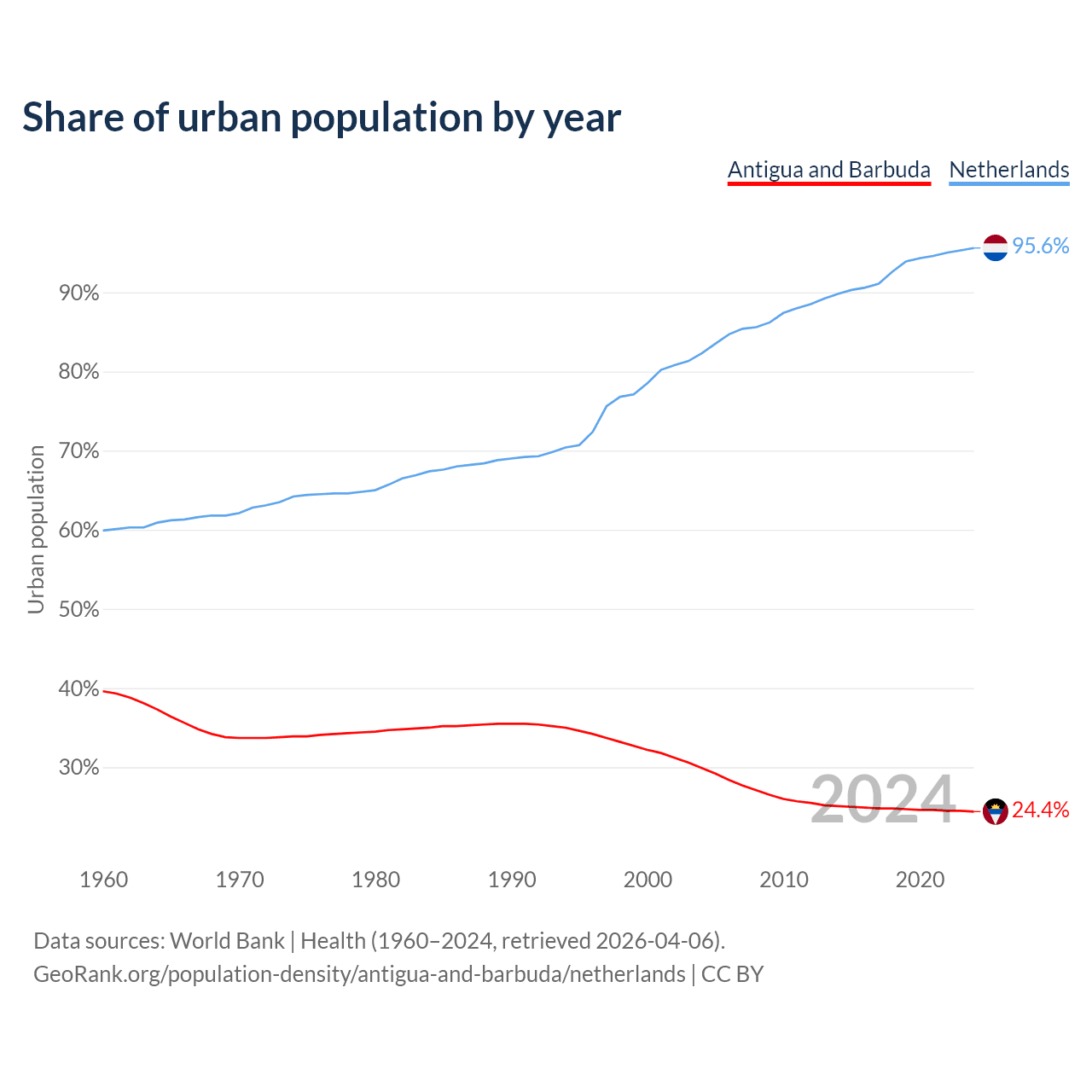From 2004 to 2024, the share of urban population changed from 29.9% to 24.4% in Antigua and Barbuda and from 82.3% to 95.6% in the Netherlands.