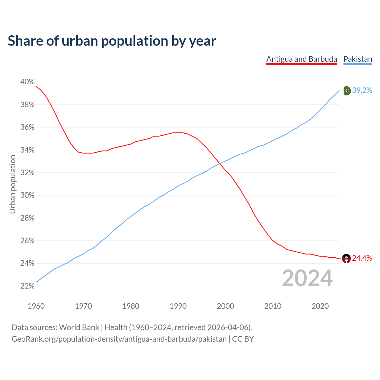 From 2004 to 2024, the share of urban population changed from 29.9% to 24.4% in Antigua and Barbuda and from 33.7% to 39.2% in Pakistan.