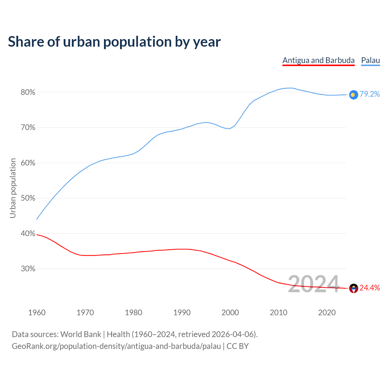 From 2004 to 2024, the share of urban population changed from 29.9% to 24.4% in Antigua and Barbuda and from 76.4% to 79.2% in Palau.